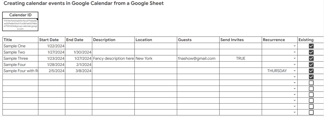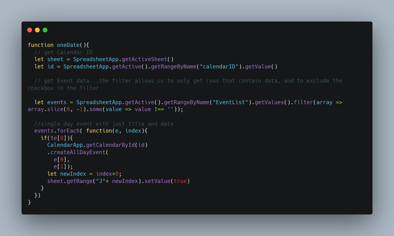 The meat and potatoes is our events.forEach loop where we go through each row without a checkbox and add the all day event to our calendar by using CalendarApp.getCalendarbyID().