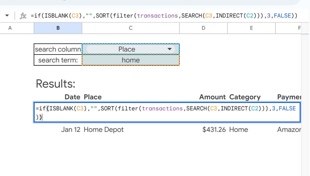 =if(ISBLANK(C3),"",SORT(filter(transactions,SEARCH(C3,INDIRECT(C2))),3,FALSE))ISBLANK()