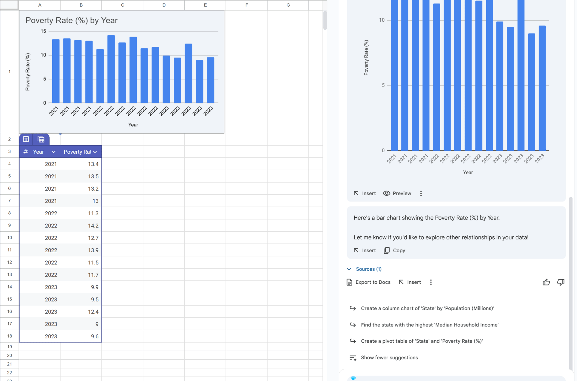 At the bottom of the chart, it has another little dialog that suggests I “Visualize Year by Poverty Rate (%)”.