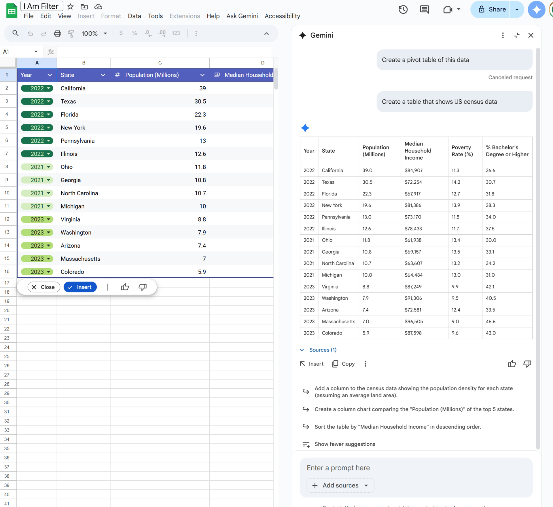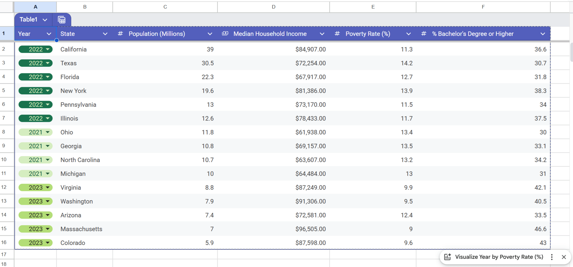 I randomly asked it to give me some census data purely to see what it would do, and it did a fair job: 16 rows with year, state, population, median income, poverty rate and education level.