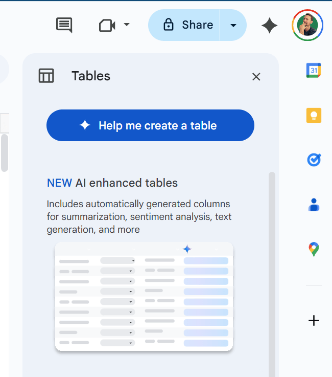 Currently, whenever you open a new Google Sheet, there’s a tables sidebar that pops up and asks if you’d like to generate a table with the click of a button.