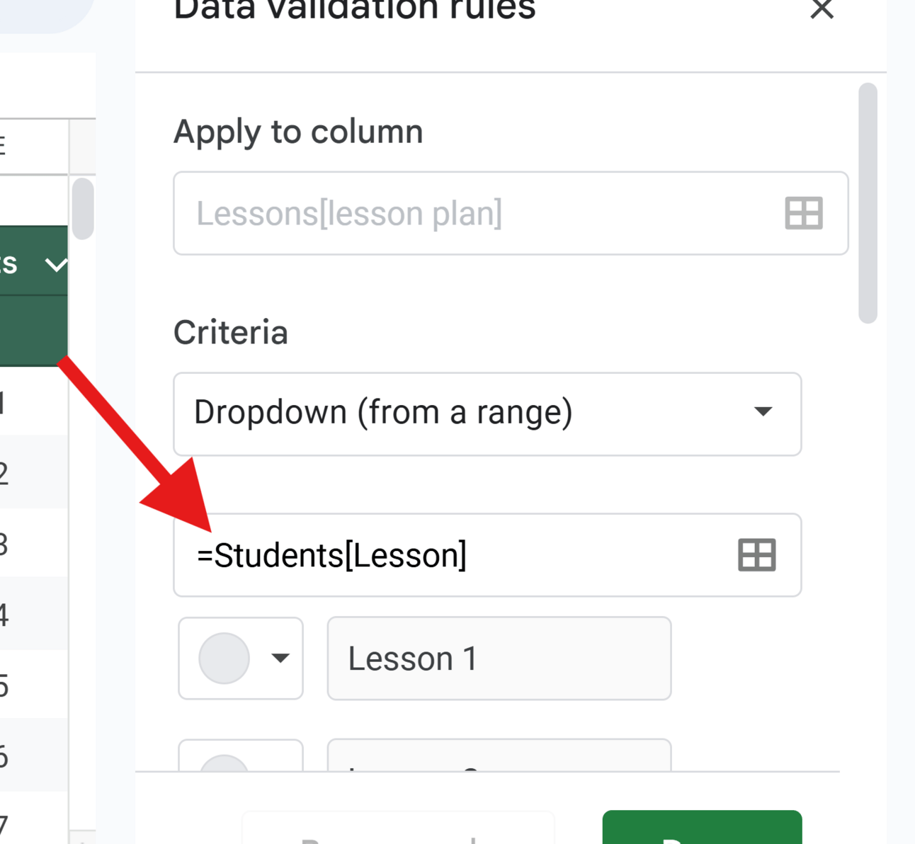 Our second dropdown list is similar, only this time we can use the table column reference instead of an actual named range. This is very useful since if we add a new lesson to the table, it will automatically be included in our dropdown list here.