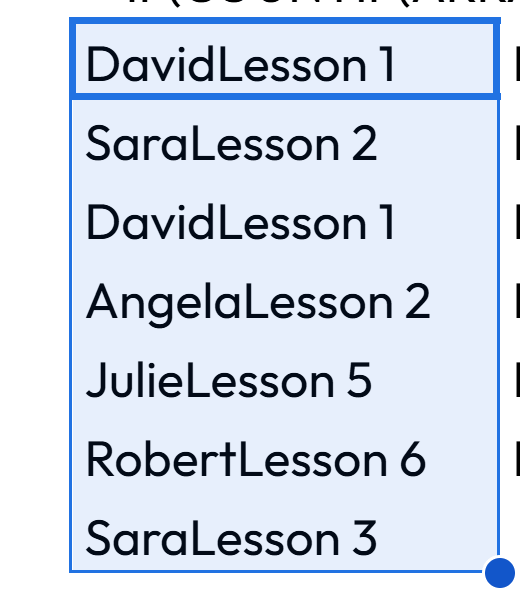 This formula generates a list of all the name + lesson combinations in our Lesson table: ARRAYFORMULA(Lessons[Student]&Lessons[lesson plan]).