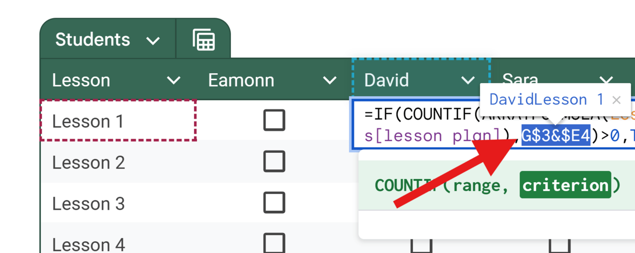 By adding a simple IF statement, we can return TRUE or FALSE depending on whether this value is in our ARRAYFORMULA list of names + lessons. We’re saying, “if the count is greater than zero”, return TRUE.