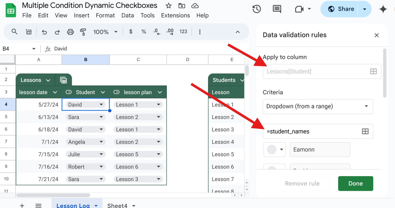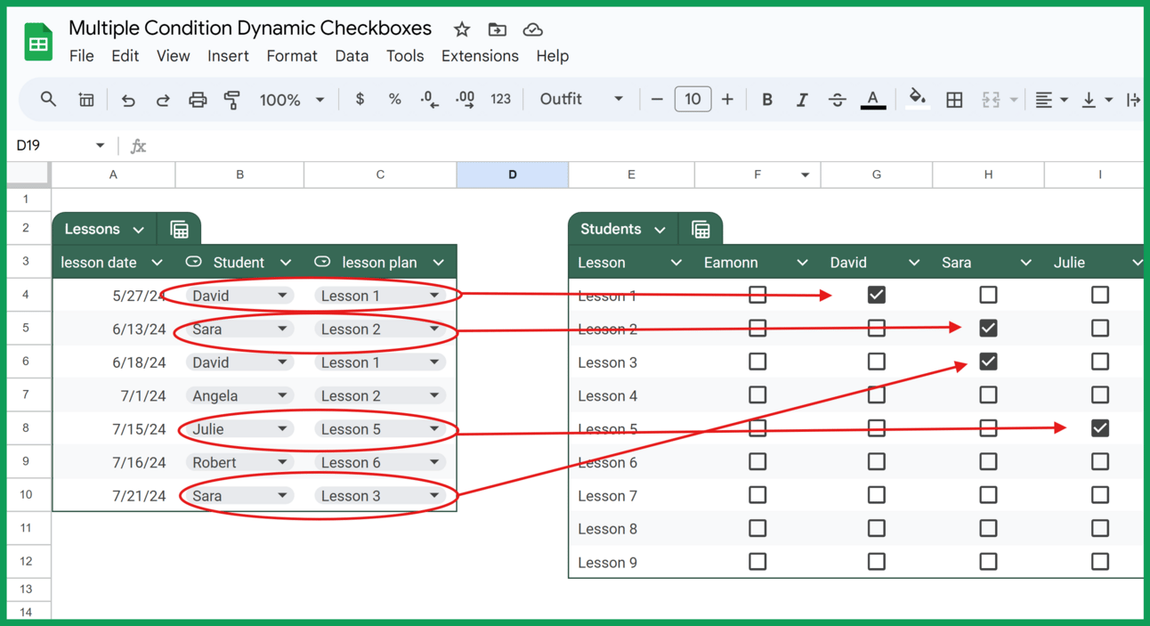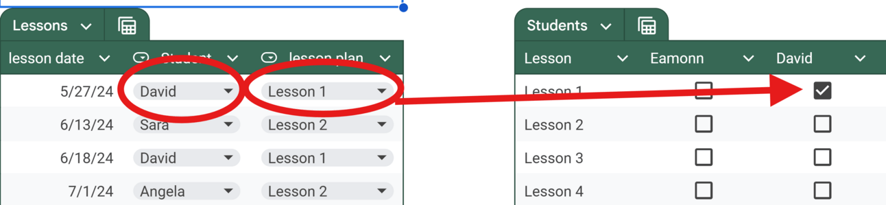 We want the sheet to do the work for us. When we enter a new lesson in the Lessons table, we want the Students table to automatically check off that lesson under the corresponding student’s name.