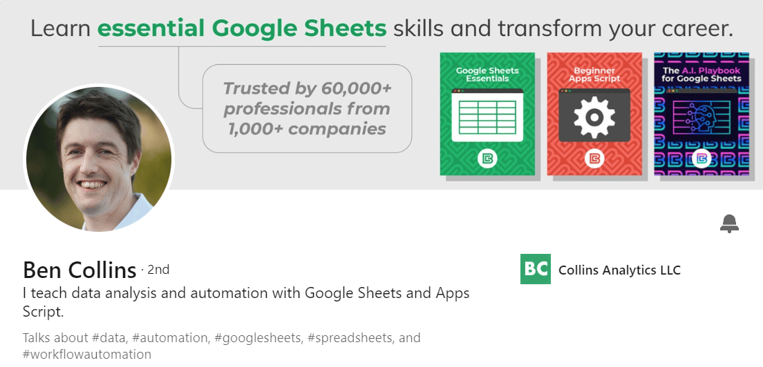 Ben’s website at benlcollins.com is a treasure trove of info for all things Sheets. He has a weekly newsletter that is easy to digest but full of valuable info, several courses and a catelog of tutorial articles in the Google Workspace ecosystem.