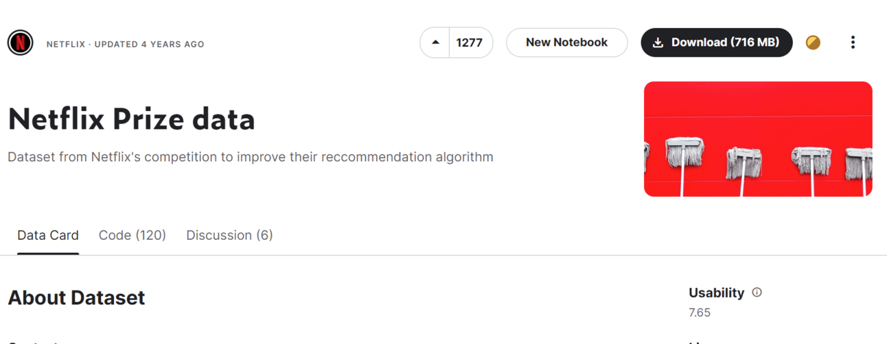 You can try to wrangle this dataset by downloading it from Kaggle. Unzipped, it’s a whopping 2.13 GB worth of txt and csv files consisting of movie ID’s, release years, titles, customer IDs, and ratings.